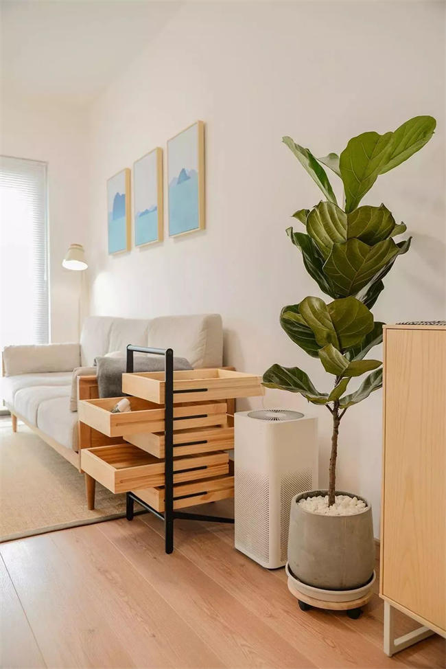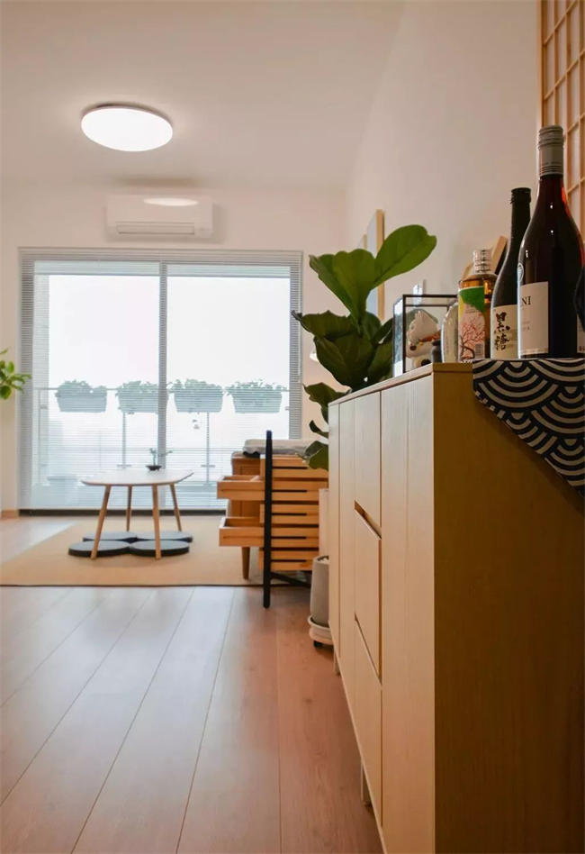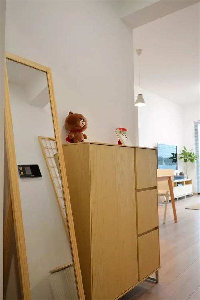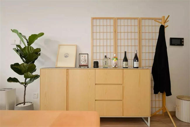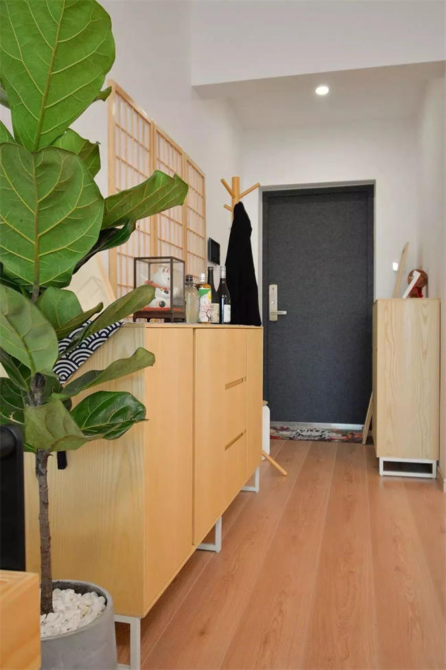 ▲ 玄關(guān)用原木收納柜+原木地板,整個空間充滿原木的氣息,搭配大株綠植裝飾,入戶就給人清新的感覺。