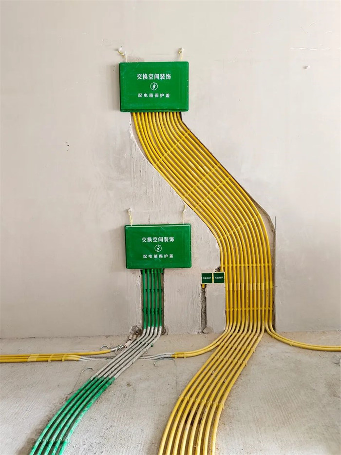 △強弱電線管交叉,強電黃色、弱電綠色不允許混用,弱電線管整齊纏繞錫箔紙,兩頭平直,兩邊各超出強電線管150mm,合格。