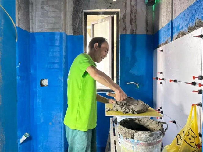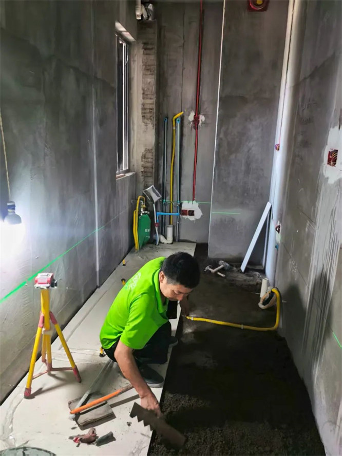我們的瓦工師傅會(huì)先用水平儀測(cè)量一下地面是否平整。