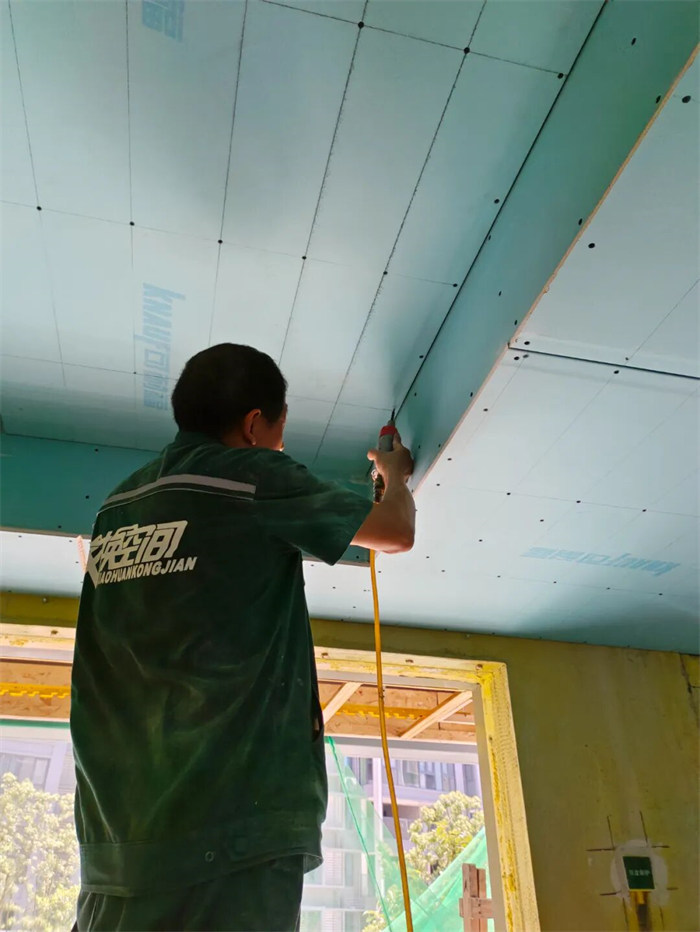 △師傅正手持電鉆固定板材,板材拼接處,縫隙控制得極為精準,每顆釘子的間距都有嚴格標(biāo)準