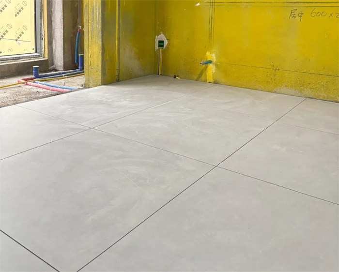 △我們的瓦工師傅正在貼磚,每鋪一塊瓷磚,都會用橡皮錘反復(fù)敲實,確保瓷磚和地面貼合緊密。