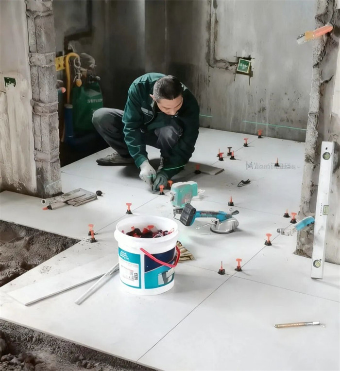△這是我們的瓦工師傅正在用瓷磚調(diào)平器,這是為了每塊磚與磚的平整度完全一致。