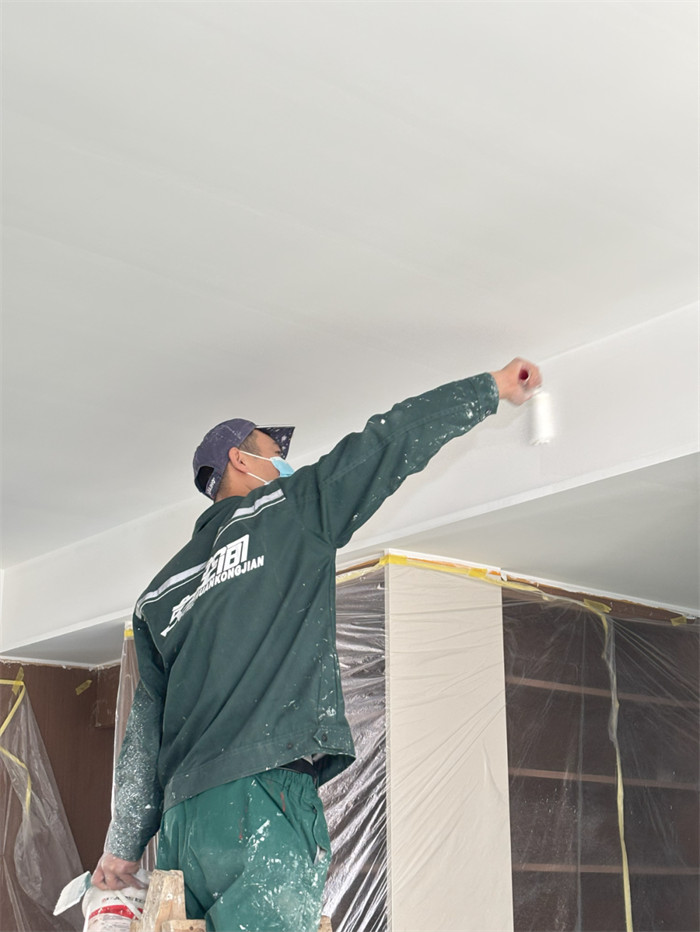△工人師傅身著規(guī)范工服,正細致地進行墻面涂刷作業(yè)。從防護措施的周密布置,到涂刷動作的均勻細致,每一個步驟都體現(xiàn)著對工藝標準的堅守。