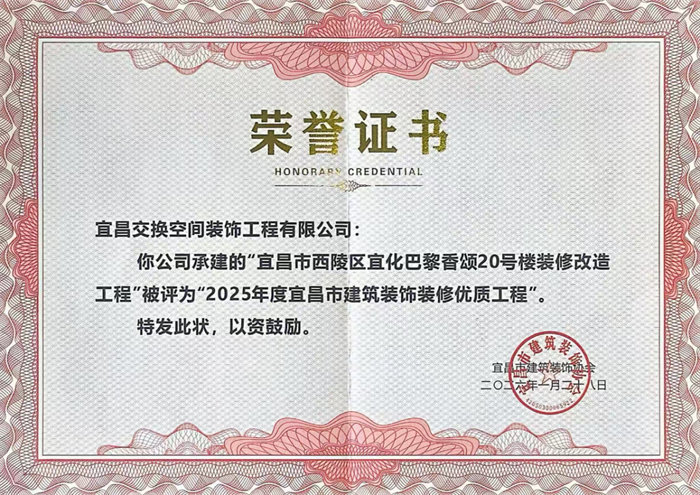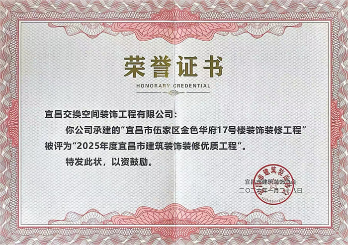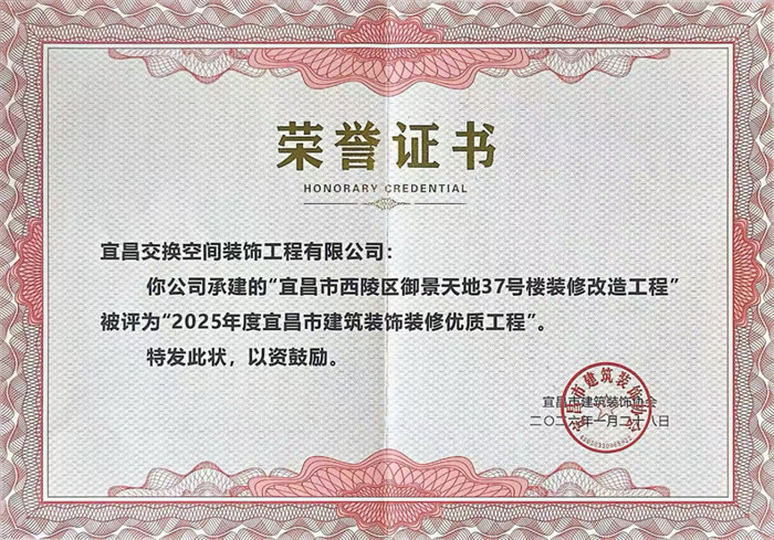 我司承建的5個項(xiàng)目,憑借扎實(shí)的施工質(zhì)量、精湛的工藝水準(zhǔn)及完美的落地效果,榮獲“2025年度宜昌市建筑裝飾裝修優(yōu)質(zhì)工程”稱號。