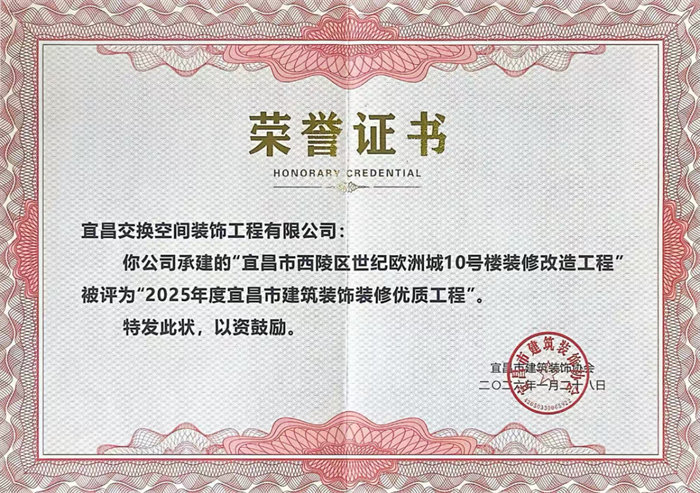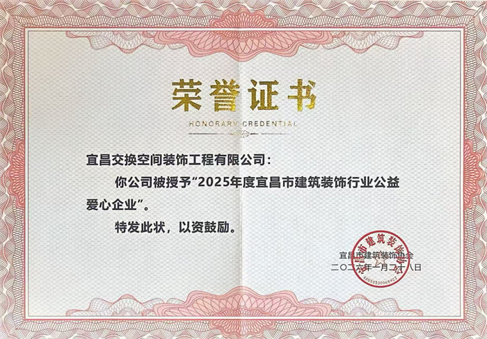 與此同時,交換空間裝飾積極履行社會責(zé)任,投身公益事業(yè),被授予“2025年度宜昌市建筑裝飾行業(yè)公益愛心企業(yè)”榮譽(yù)稱號。
