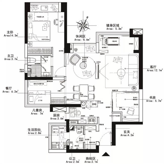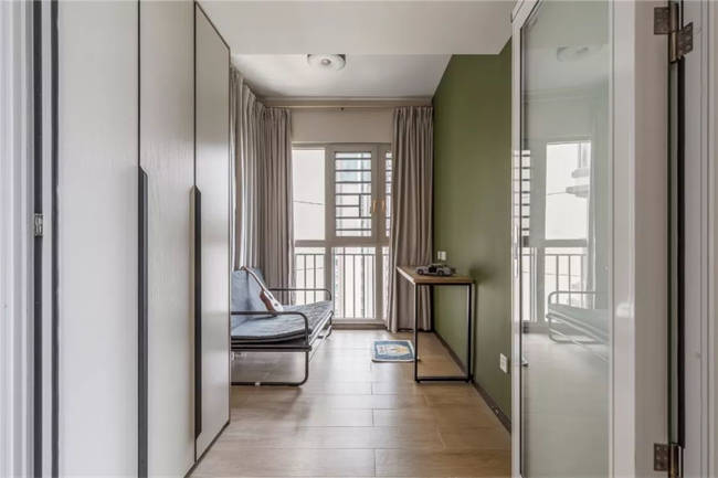 玄關(guān)走廊的墻面采用黑板墻的設(shè)計(jì),從入戶就奠定文藝氣息。另一側(cè)的墻體做了部分的嵌入式設(shè)計(jì),把冰箱內(nèi)嵌里面。