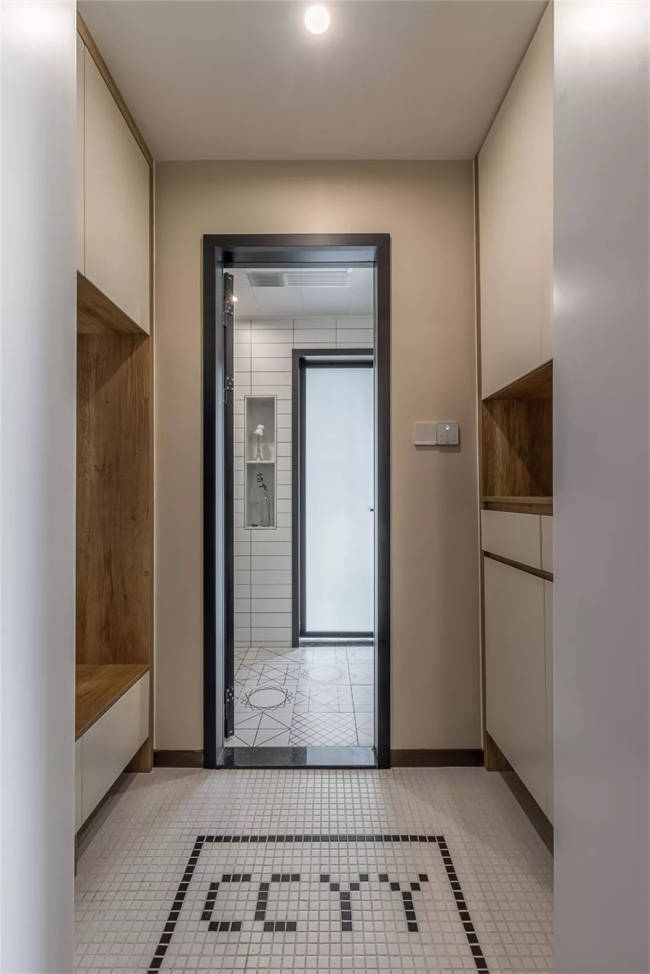 玄關(guān)柜是鞋柜和換鞋凳結(jié)合的設(shè)計(jì),便捷實(shí)用,地面白色小磚內(nèi)嵌入黑色磚塊做圖案,顯得簡潔又文藝。