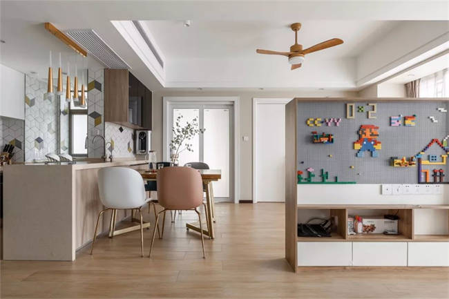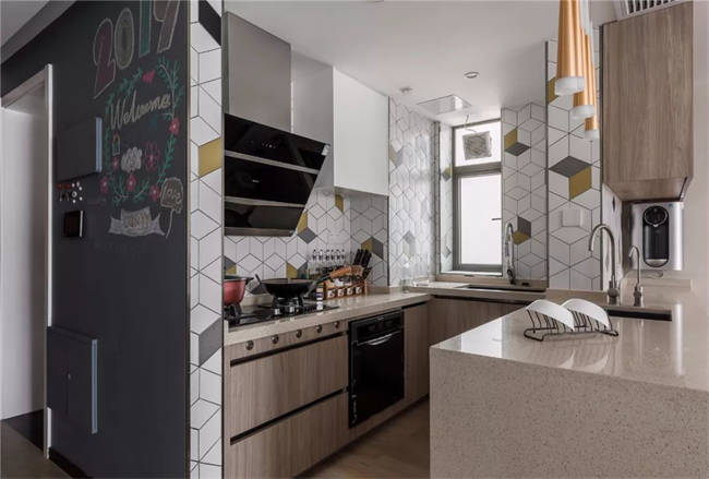 廚房內(nèi)部的櫥柜設(shè)計(jì)L形的布局,廚房和餐廳之間用吧臺作為隔斷,墻面創(chuàng)意的幾何瓷磚讓廚房看起來更加寬敞。
