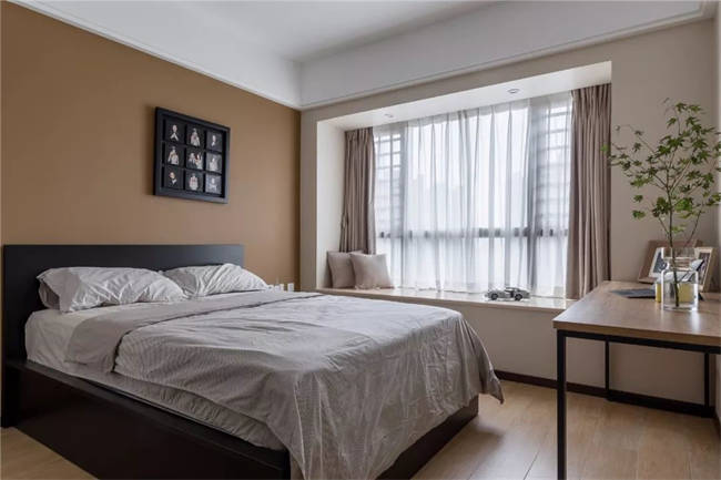 主臥室的床頭背景墻刷成了深咖色,灰粉色飄窗窗簾與角落的綠植搭配,別有一番風(fēng)味。