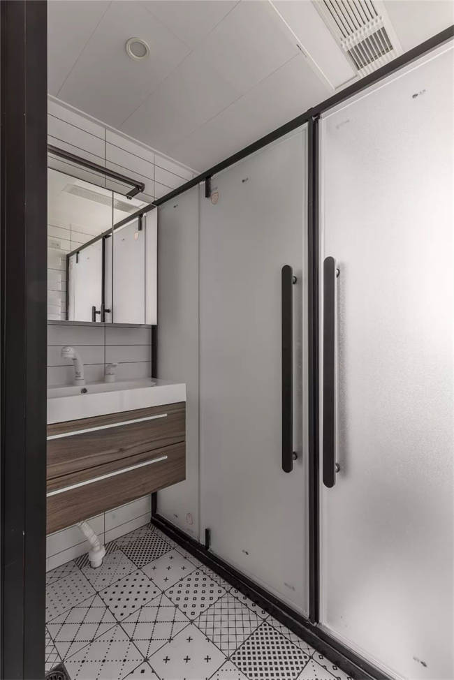 衛(wèi)生間做了干濕分離的設(shè)計(jì),地面鋪貼了黑白色的花磚,用磨砂的玻璃門作為淋浴房的隔斷,讓衛(wèi)生間多出一些私密感。
