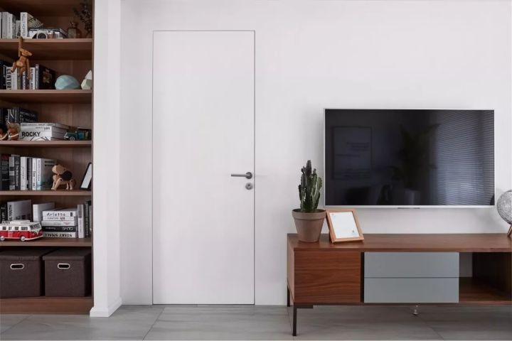 電視背景墻簡單的刷白漆,所以很好的把進(jìn)入臥室的門藏起來了,這就是我們常常聽到的隱形門。