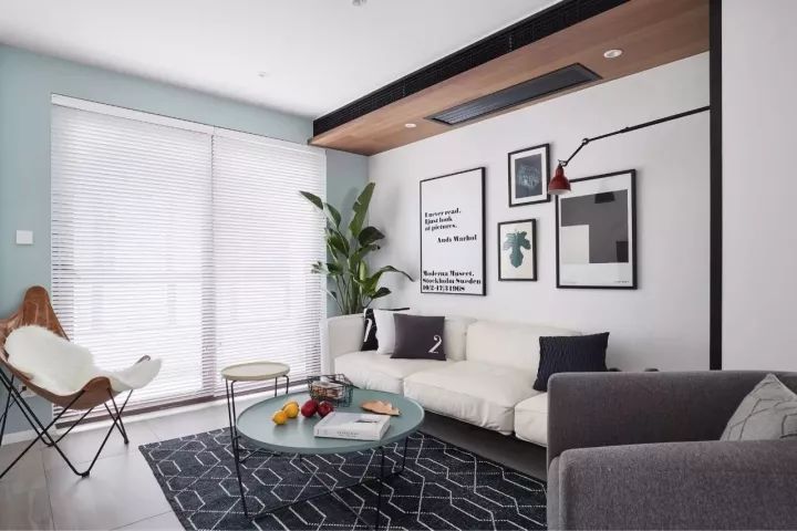 陽臺推拉門的墻面刷成青色,沙發(fā)背景墻刷白漆并用一組掛畫裝飾,再搭配舒適的淺色沙發(fā)、灰色椅子,地面再鋪上一塊地毯,簡約舒適的客廳就出來了。