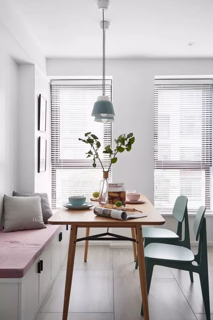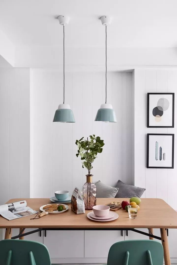 兩盞單頭吊燈正對的餐桌,讓就餐顯得更加有情調(diào)。