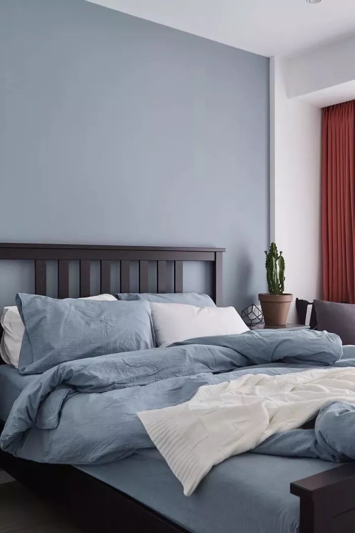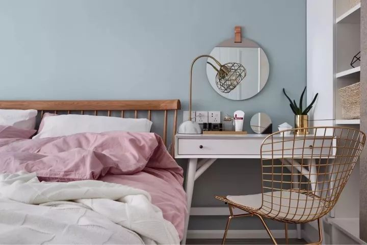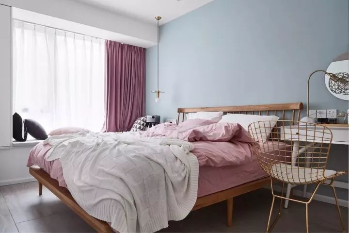 藍(lán)色的背景墻,選用木色的床,再搭配粉色的被子,這樣的組合讓人百看不厭。