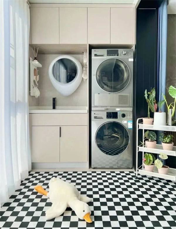 可以放置一個陽臺柜,在進(jìn)行收納的同時,也可以放置生活需要的洗衣機和烘干機等家具。