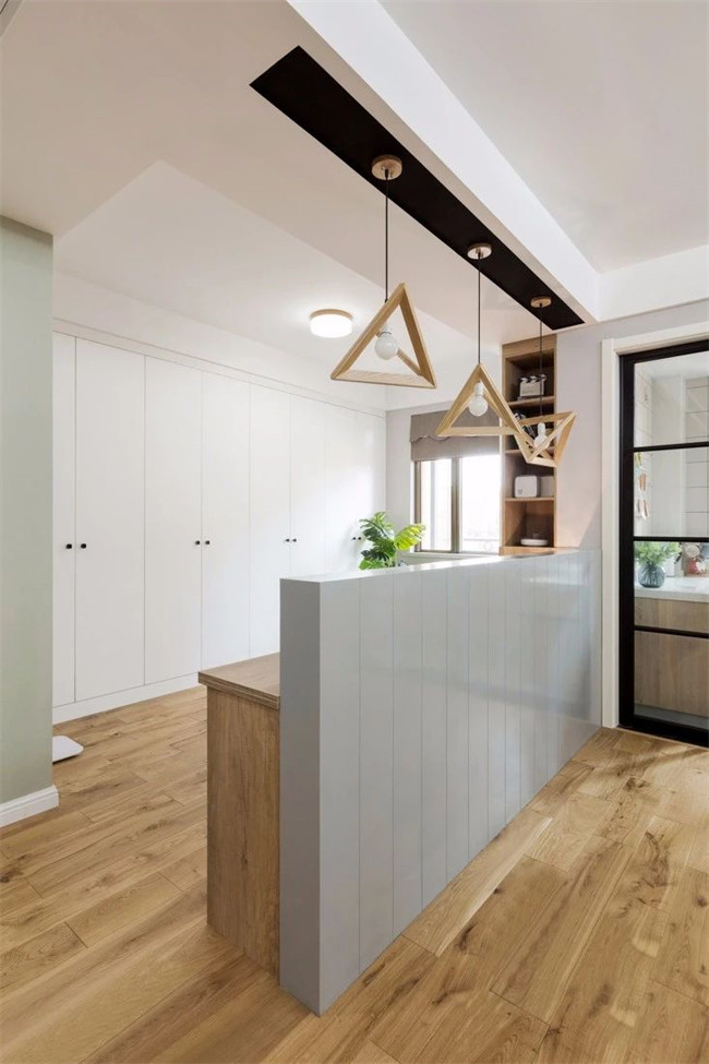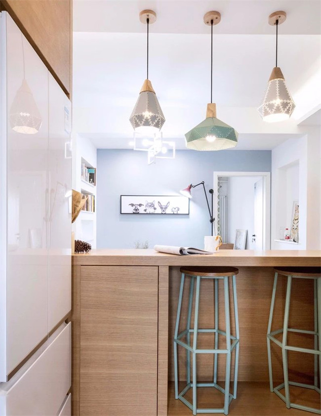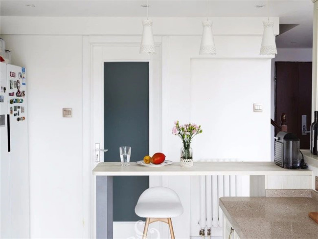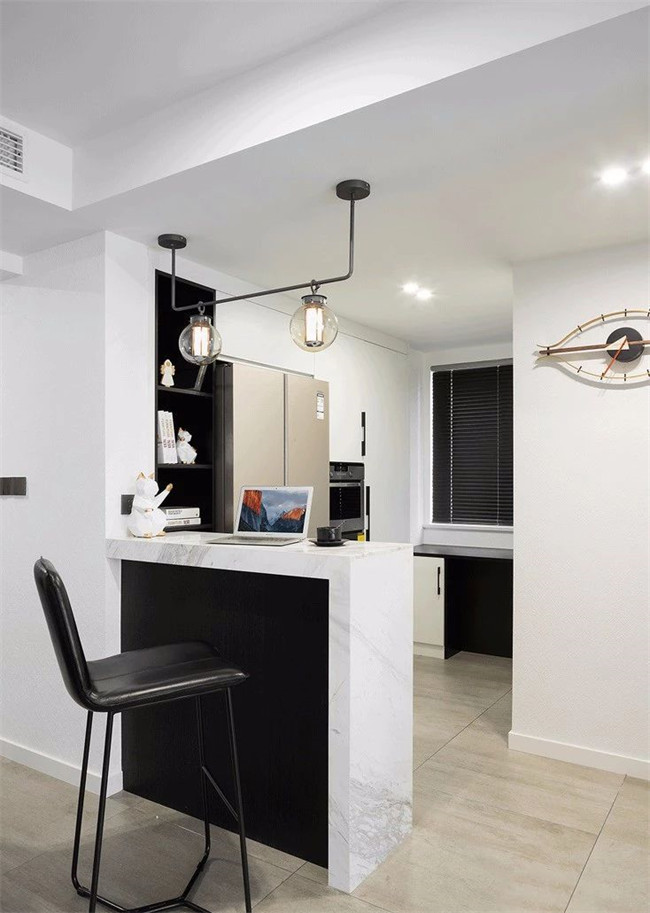 不知道廚房區(qū)域如何分割?除了推拉門之外,喜歡開放式廚房的朋友則可以選擇做個小吧臺,它也可以成為用餐區(qū),這樣一來不僅貌美而且有效提高了空間利用率。