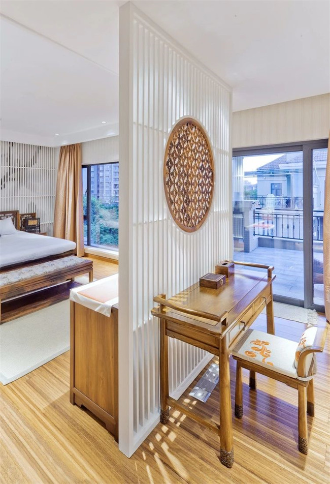 如果不喜歡擺個諾大的柜子,或者空間有限,那么就可以考慮放個小屏風隔一隔空間,貌美的屏風隔斷絕對能為你的空間增添不少姿色~