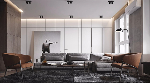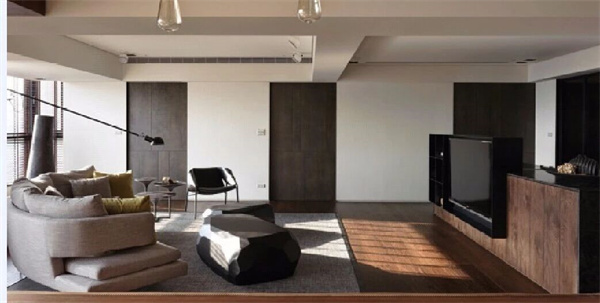 在空間的兩邊設(shè)置柜體,沙發(fā)居中放置,與沙發(fā)正中間對應(yīng)的背景墻的位置,做內(nèi)嵌式處理,兩邊均為柜體,若空間足夠,沙發(fā)后放置書桌或者吧臺,在空間布局上,兩邊也是柜體,一側(cè)服務(wù)于客廳,另一側(cè)服務(wù)于沙發(fā)隔出來的空間,比如開放式書房、或者吧臺等等,靈活多變,功能齊全。