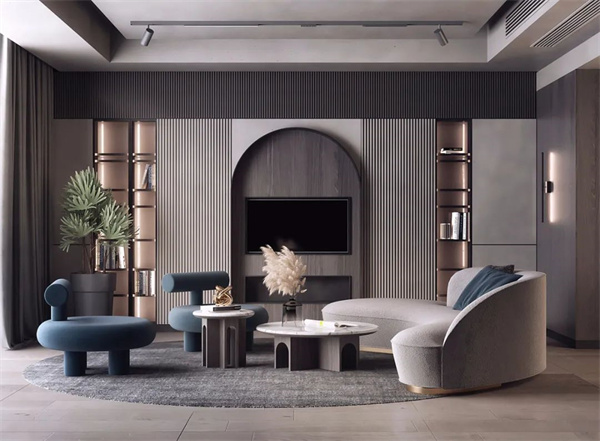 2)沙發(fā)居中,兩邊柜體,電視內(nèi)嵌式設(shè)置