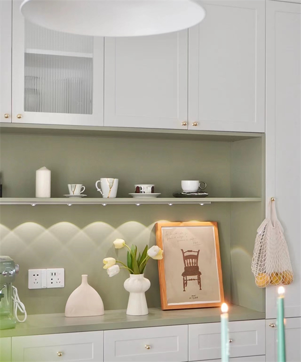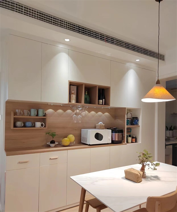 在定制餐邊柜的時(shí)候,不要給餐邊柜全裝上柜門,要在餐邊柜中間加上開放層,有了開放層就可以放置一些常用的物品,同時(shí)在開放層上也可以擺上裝飾品,增加餐廳空間的設(shè)計(jì)氛圍。