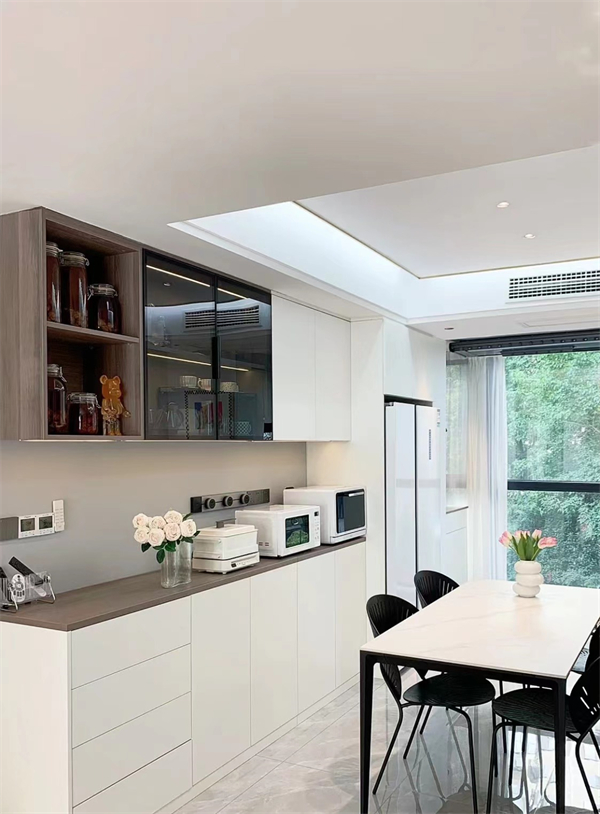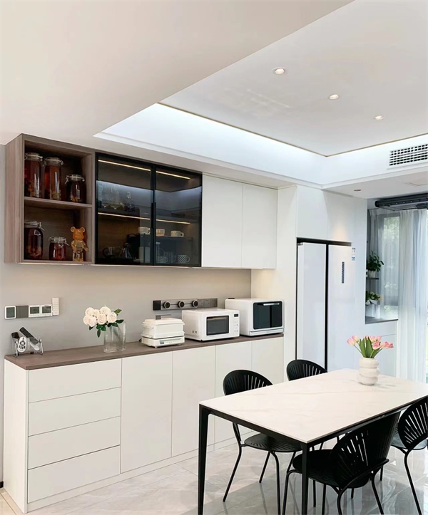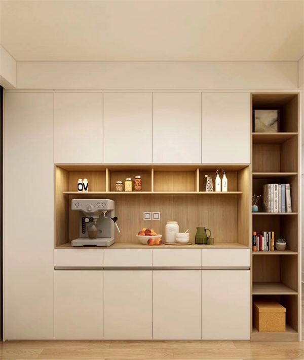 一些小家電可以放在餐邊柜的開放層里,方便直接使用,無需跑進(jìn)廚房,比如:電飯鍋、微波爐等。
