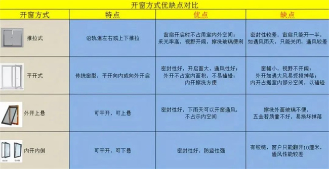 常用的有4中開(kāi)窗方式:推拉式、平開(kāi)窗、外開(kāi)上懸、內(nèi)開(kāi)內(nèi)倒。一般家里使用推拉式、平開(kāi)式的開(kāi)窗方式比較多,具體優(yōu)缺點(diǎn)對(duì)比可參考下圖。