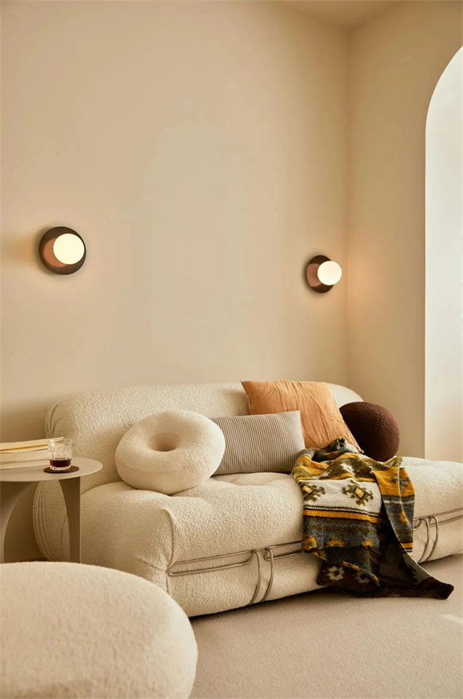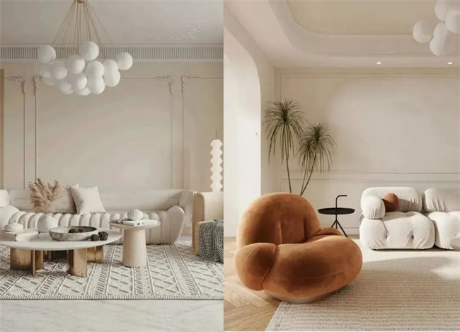 材質(zhì)方面為了符合奶油系風(fēng)格的調(diào)性,材質(zhì)上要選擇比較有肌理感的,像羔羊絨、棉麻、原木等材質(zhì)都很合適。