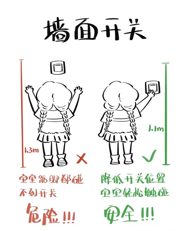 建議把開(kāi)關(guān)從正常的1.3m調(diào)整到離地面1.1m的位置,小朋友也可以輕松觸碰開(kāi)關(guān)啦~