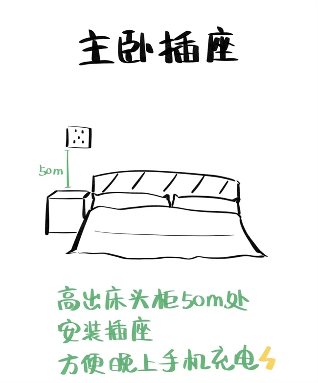 在高出床頭柜50m處設(shè)置五孔插座,晚上在床邊伸手就能觸及。