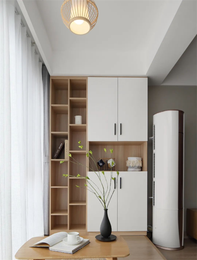 飄窗上安裝這樣的吊燈,很有情趣,垂直的光線,正好打在書柜上方,為閱讀提供了充足的光線。