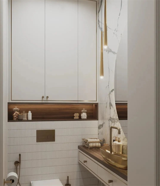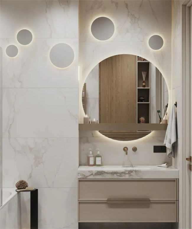 此款浴室燈光設(shè)計,造型非常獨特,層次感十足,這種獨特的設(shè)計,讓浴室變得時尚大氣。