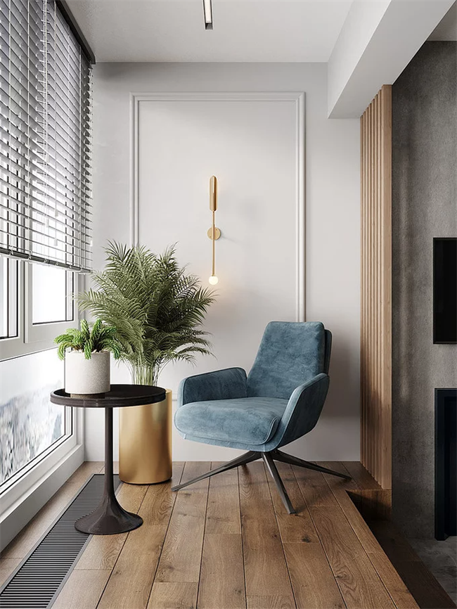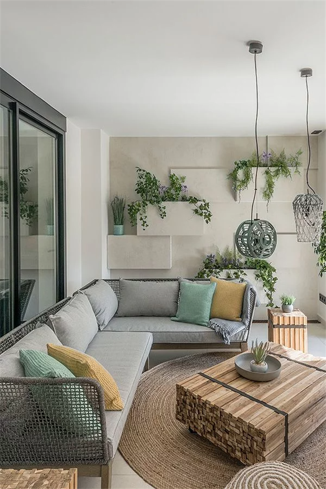 樸實無華的水泥風格也是陽臺設計的一大趨勢,高級灰的質感透漏出簡約的藝術感,如果還想保留溫馨的氛圍,可以通過綠植、燈光等軟裝點綴,能讓鋪水泥地磚的陽臺變得活潑有趣。
