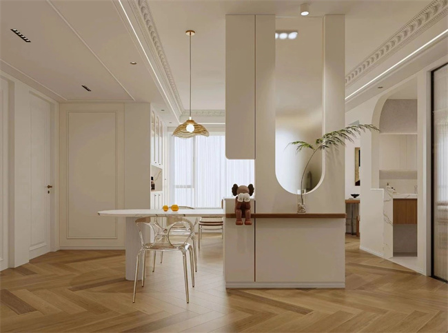 對(duì)于沒(méi)辦法同時(shí)容納玄關(guān)和餐廳的小戶型來(lái)說(shuō),不如直接設(shè)計(jì)一個(gè)帶有柜體的吧臺(tái)。既充當(dāng)餐桌,又能作為隔斷,兩全其美。