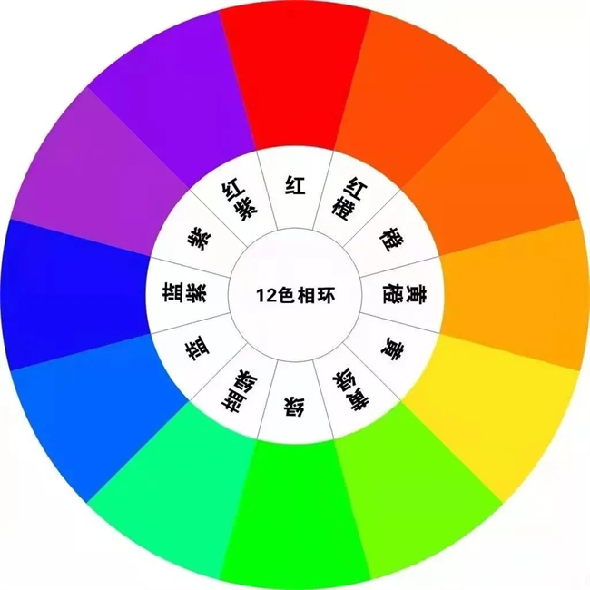 色相:色相是指色彩的相貌,用于區(qū)別色彩種類,比如藍色是一個色相,紅色屬于另一個色相。色相環(huán)是色相最直觀的一種表現(xiàn)形式,可以有6種、12種、24種,最常用的色相環(huán)是十二色環(huán)。