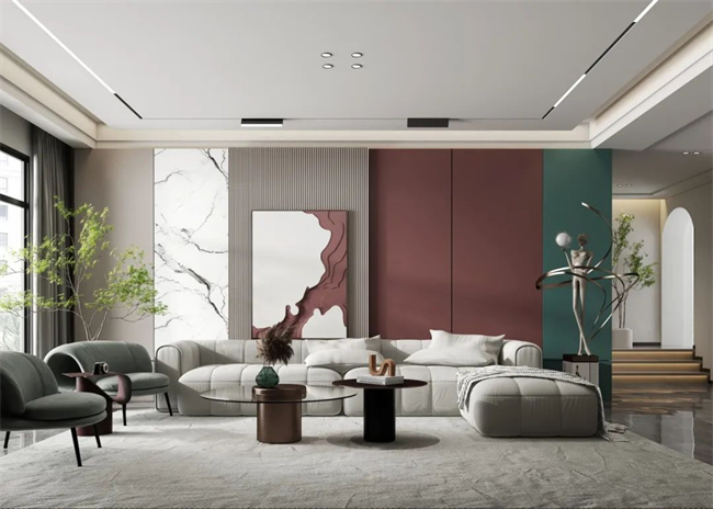 這是一種比較創(chuàng)意的設(shè)計方式,用漸變和暈染的效果,賦予空間靈動感與自由感,打造出隨性灑脫又富有藝術(shù)氣息的背景墻。