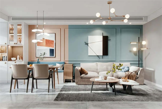 也可以利用色彩分布來劃分區(qū)域,如客餐廳一體開放式區(qū)域就常用這種設(shè)計,以此起到“隔斷”作用。