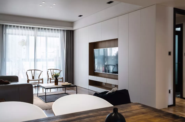 入墻式的電視墻,把電視墻裝成收納柜,同時中間留出了電視機的孔位,搭配下方一層藏光處理,整體顯得層次光感分明。