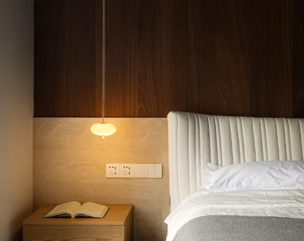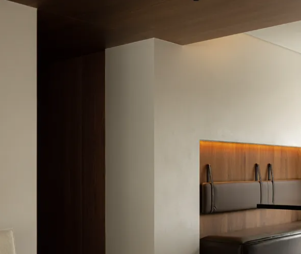 從入門(mén)處延伸到臥室的部分頂面做了深色木飾面,在視覺(jué)上壓低空間感,跟其他區(qū)域有一個(gè)空間層高上的對(duì)比,走過(guò)時(shí)有一種窄闊間豁然開(kāi)朗的情緒過(guò)渡。