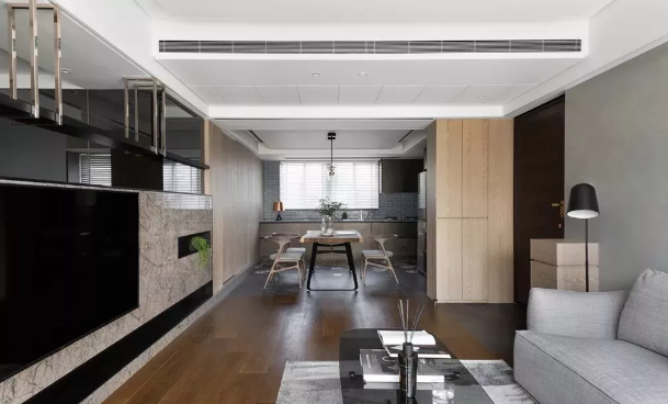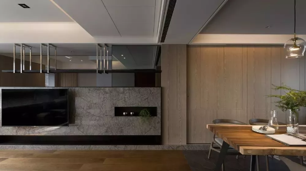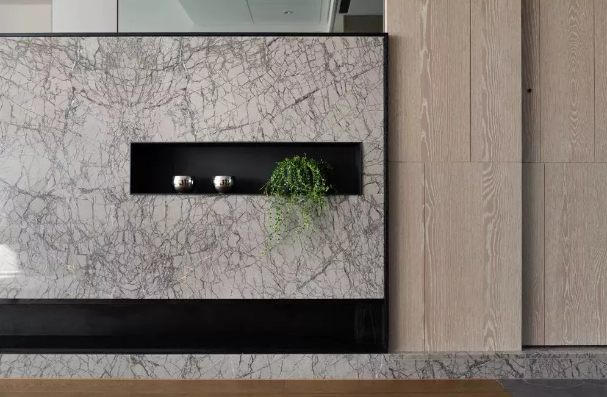 ▲電視墻大理石質(zhì)感,頂部是留空、側(cè)邊這是木飾面,在大理石中間留出一個(gè)黑色壁洞,擺上銀色擺飾與一盆小綠植,顯得清新檔次好精致。