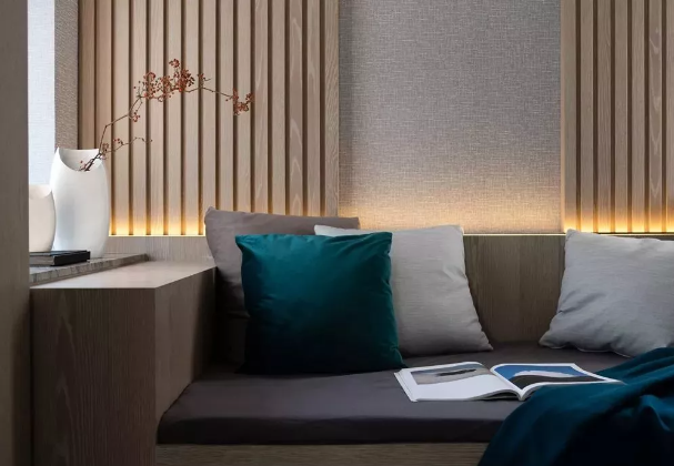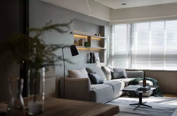 ▲L形布藝沙發(fā)挨著窗戶布置,窗戶裝上百葉簾窗簾,整個(gè)空間淡雅明亮的空間,充滿了輕松自然的氛圍感,而沙發(fā)墻上的格板架擺著精致的小飾品,顯得溫馨而與層次感。