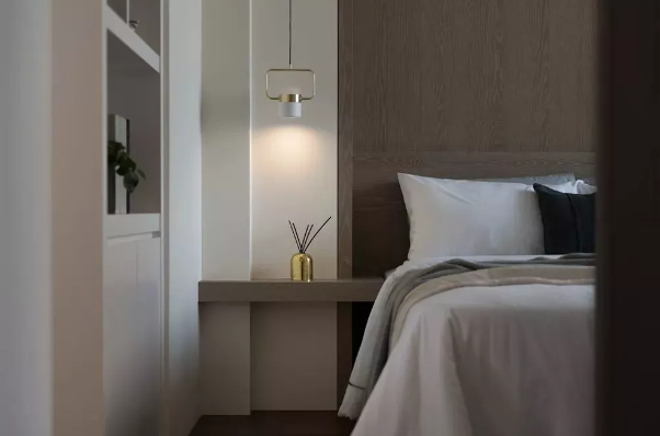 ▲木飾面的床頭背景,加入了一個(gè)格板床頭柜與床頭背景墻造型結(jié)合一體,營造出簡潔優(yōu)雅的統(tǒng)一設(shè)計(jì)效果。